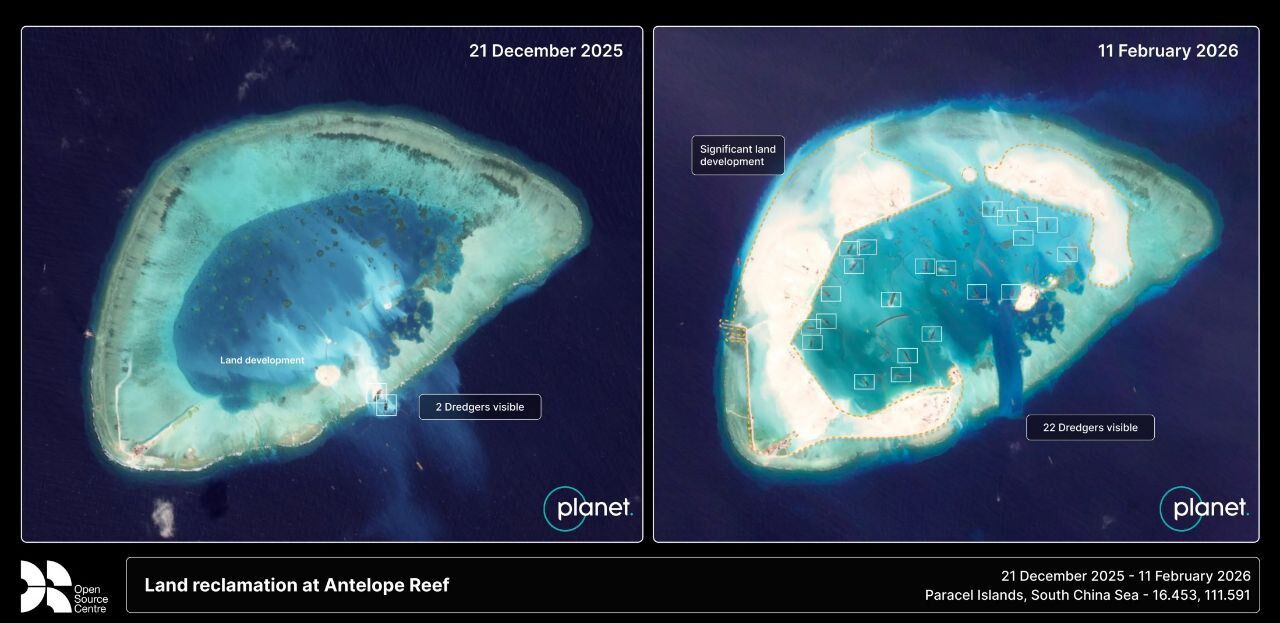 Trung Quốc đã đẩy nhanh tiến độ cải tạo đất để tạo ra một hòn đảo nhân tạo gần Rạn san hô Linh Dương ở Biển Đông. Tính đến tháng Hai, đã có 22 tàu nạo vét trong khu vực.