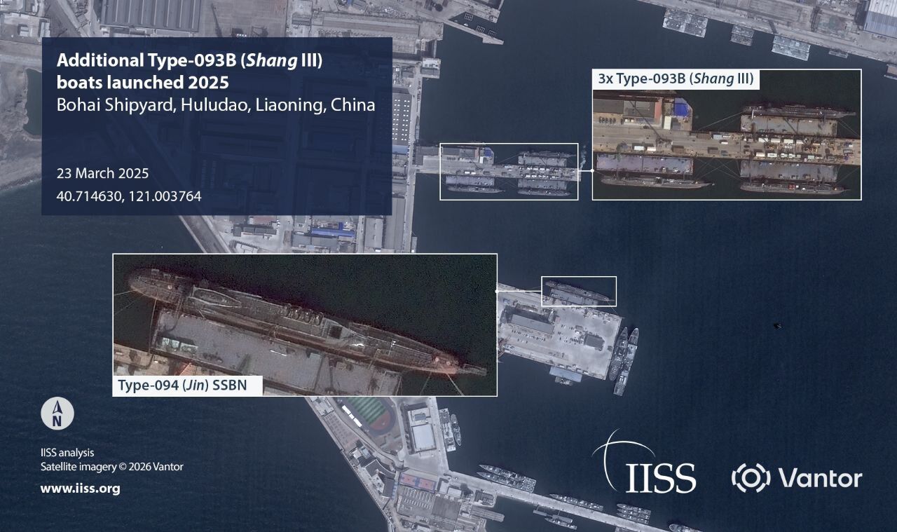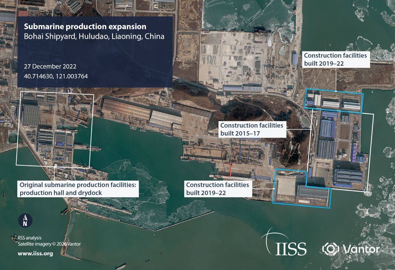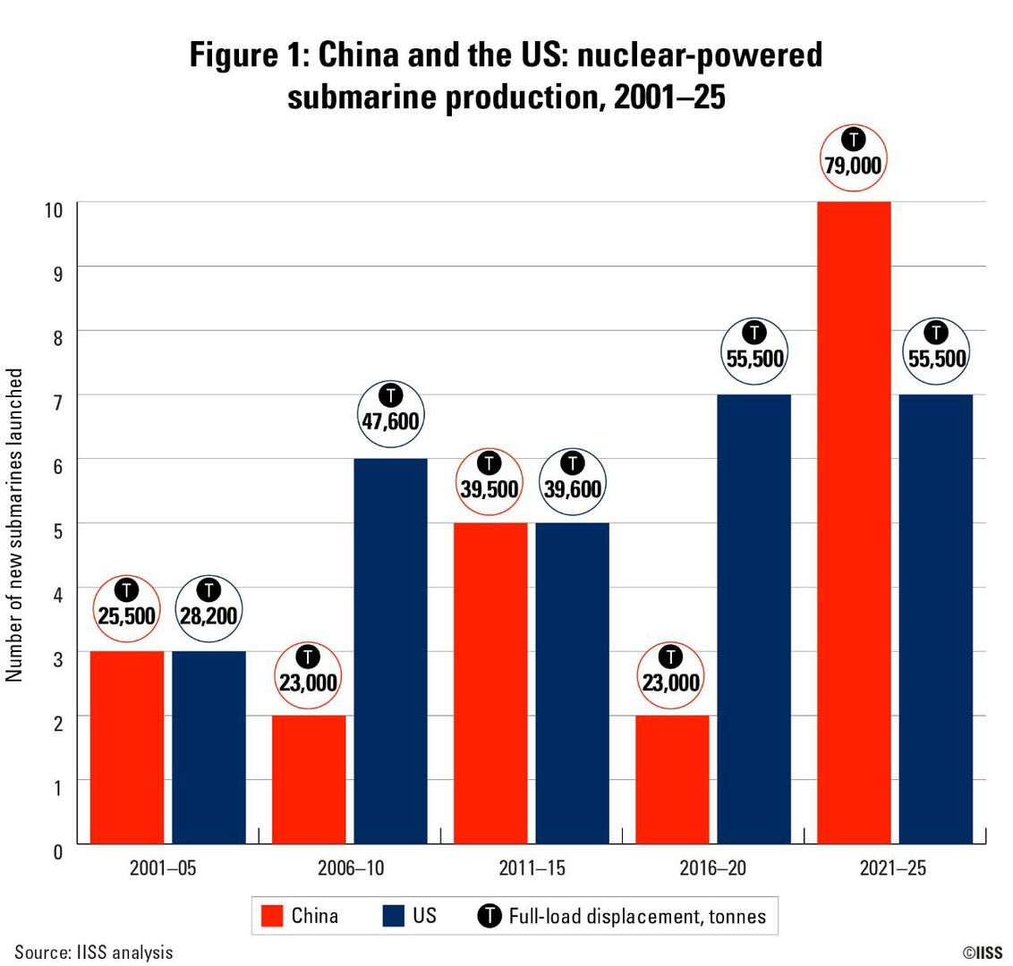 Từ năm 2021 đến năm 2025, Trung Quốc ( https://www.iiss.org/online-analysis/military-balance/2026/02/boomtime-at-bohai-china-ramps-up-submarine-production/) đã đạt được bước đột phá trong sản xuất hàng loạt tàu ngầm hạt nhân, lần đầu tiên vượt qua Hoa Kỳ về số lượng hạ thủy và tổng trọng tải.