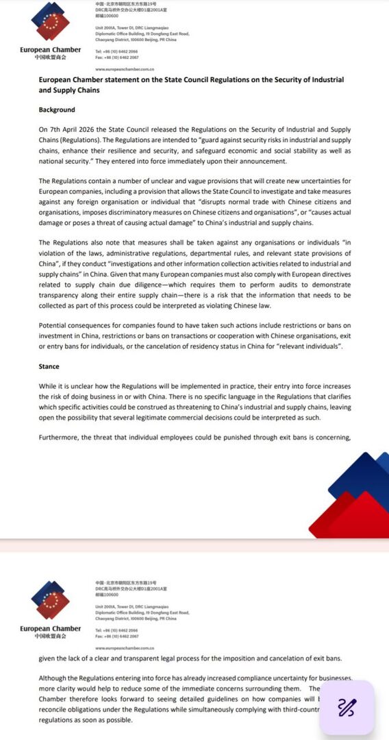 Các công ty châu Âu đang hết sức lo ngại trước luật chuỗi cung ứng mới của Trung Quốc. Một tuyên bố từ Phòng Thương mại và Công nghiệp EU tại Trung Quốc cho biết các công ty sẽ gặp khó khăn trong việc tuân thủ cả quy định của EU và Trung Quốc.