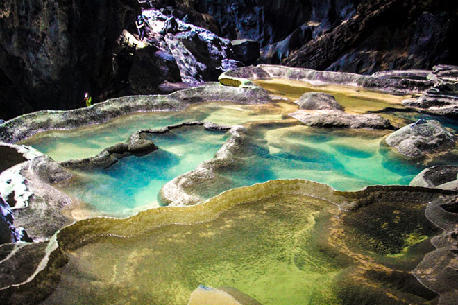 Hố sụt Vọng Khủng Long mùa mưa với những dòng thác nước tạo nên khung cảnh huyền ảo.