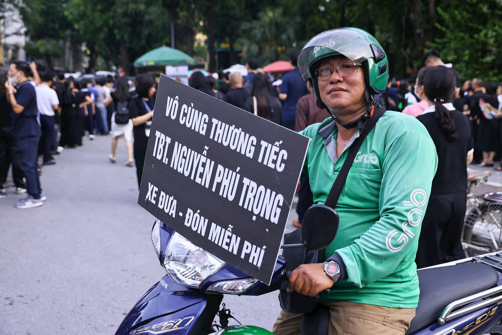 Ông xúc động chia sẻ: “Cả cuộc đời Tổng Bí thư đã vì dân vì nước. Tổng Bí thư ra đi để lại niềm tiếc thương vô hạn của người dân khắp cả nước, kiều bào và bạn bè quốc tế. Trong ngày Quốc tang này, tôi cũng muốn góp chút sức nhỏ của mình để giúp đỡ những người xa xứ đến Thủ đô để thăm viếng bác, bởi công việc của tôi là chạy xe ôm công nghệ nên nắm rõ những cung đường chung quanh nhà tang lễ”.