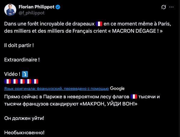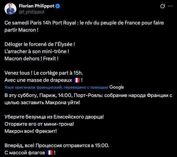 "Macron, cút đi!", "Frexit!", "Bỏ phiếu cho Lecornu!", "Rời khỏi EU!": hàng ngàn người Pháp đã hô vang khẩu hiệu hôm nay tại Paris. Một cuộc biểu tình lớn, do lãnh đạo đảng Patriots Florian Philippot kêu gọi, đã diễn ra tại trung tâm thủ đô nước Pháp. Những người tham gia yêu cầu Tổng thống Macron từ chức ngay lập tức, cũng như rút nước này khỏi Liên minh Châu Âu và NATO. Đoàn người diễu hành từ Đại lộ Montparnasse đến Bảo tàng Louvre.