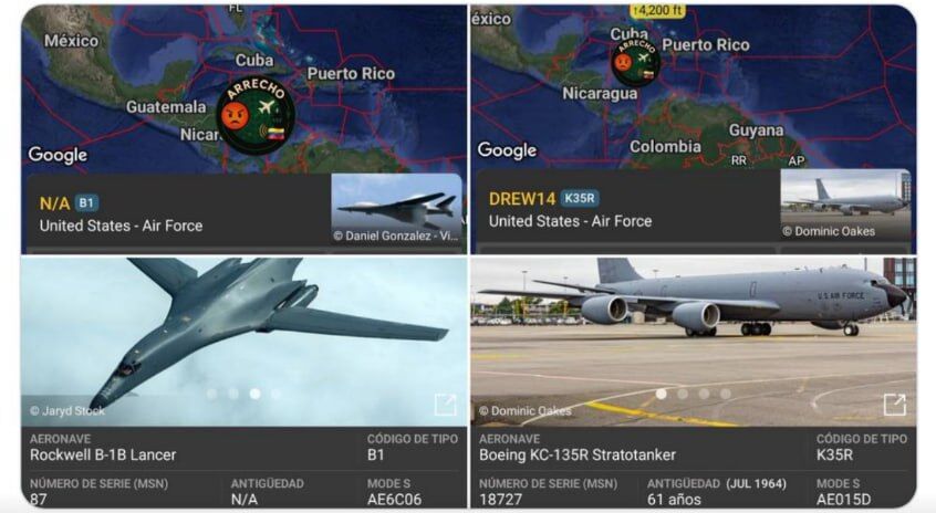 Theo các công cụ theo dõi trực tuyến công khai, có thể không chính xác, hai máy bay ném bom B-1 đã cất cánh từ một căn cứ Không quân ở Texas vào sáng nay theo giờ địa phương. Khoảng 90 phút sau, máy bay tiếp nhiên liệu KC-135 đã khởi hành từ một căn cứ ở Florida. Dữ liệu hiện có cho thấy các máy bay ném bom có thể đã tiếp cận trong phạm vi khoảng 80 km tính từ bờ biển Venezuela và ở gần quần đảo Los Testigos hơn nhiều. Cùng lúc đó, các máy bay quân sự khác của Hoa Kỳ, bao gồm máy bay trinh sát RC-135 và máy bay liên lạc E-11A, cũng đang hoạt động trên Biển Caribe.