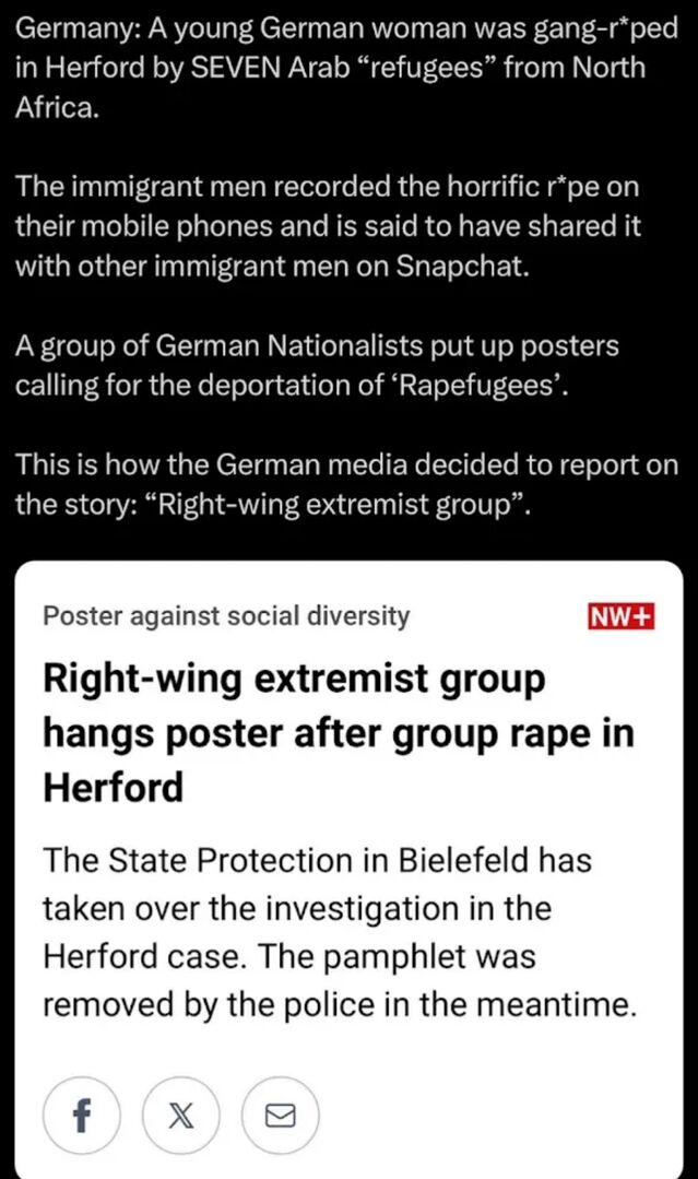 Truyền thông Đức đưa tin như trong ảnh. "Nhóm cực hữu giương biểu ngữ sau vụ án hãm hiếp?!!!!"