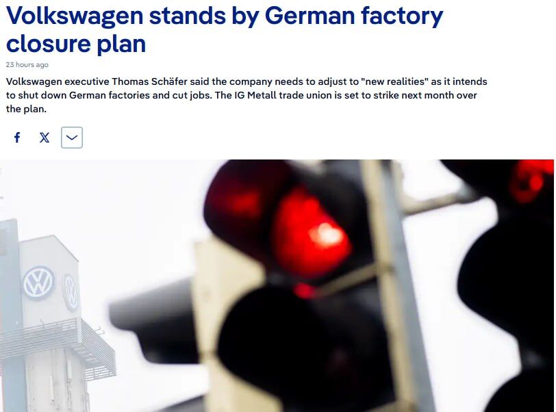 ➖Là một phần của cuộc biểu tình ở Wolfsburg, một “đám tang” của Volkswagen đã diễn ra. Đoàn rước khiêng quan tài mang tên công ty qua các tuyến phố. ➖Công đoàn Đức tuyên bố bắt đầu đình công từ ngày 1/12. Hành động này là phản ứng trước những khó khăn tài chính của công ty do nhu cầu ô tô ở châu Âu giảm và sự cạnh tranh ngày càng tăng từ các nhà sản xuất ô tô Trung Quốc.