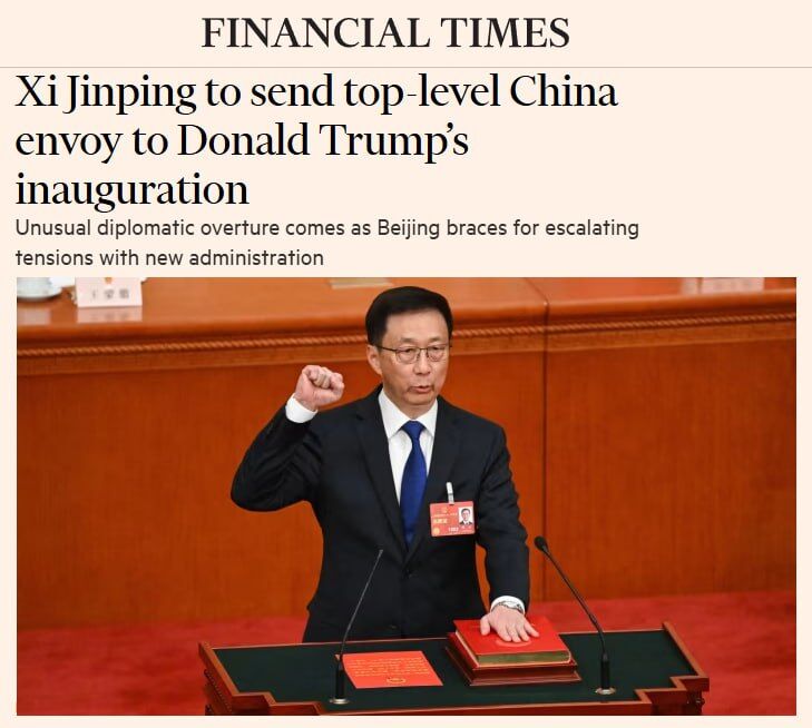 Tập Cận Bình sẽ cử quan chức cấp cao tới dự lễ nhậm chức của Trump Các nguồn tin đã đưa tin với tờ Financial Times rằng đại diện Trung Quốc có ý định tổ chức một cuộc gặp riêng với Tổng thống đắc cử của Hoa Kỳ. Theo ấn phẩm này, Washington và Bắc Kinh đang thảo luận về các ứng cử viên, và nhóm của Trump khẳng định rằng đó phải là quan chức có ảnh hưởng nhất.