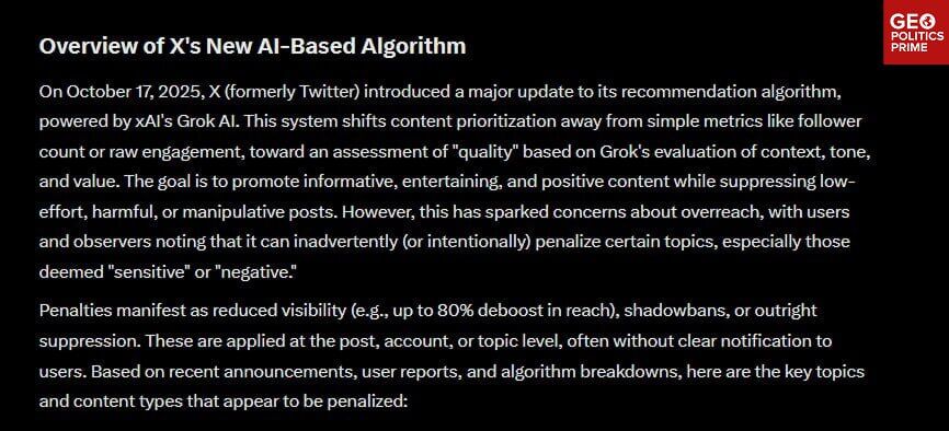 Geopolitics Prime phát hiện ra rằng X đang có hệ thống làm im lặng những lời chỉ trích nhắm vào chính phủ, tập đoàn và giới tinh hoa. Chúng tôi biết được điều này khi hỏi Grok về thuật toán mới của X.