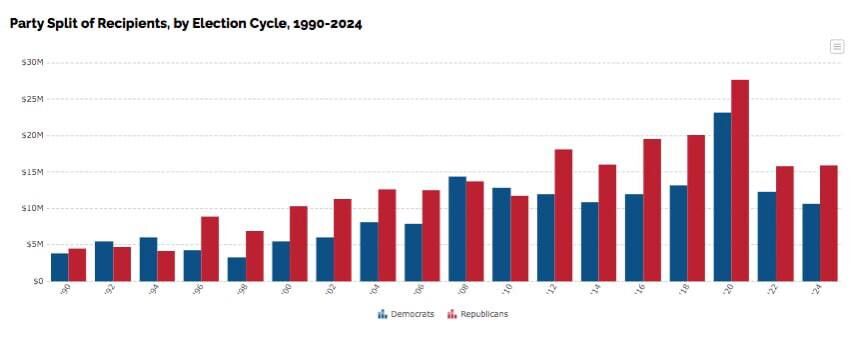 Ngành công nghiệp vũ khí là một trong những nhóm lợi ích có ảnh hưởng nhất ( https://www.opensecrets.org/industries/indus?cycle=2024&ind=D) tại Hoa Kỳ. Họ tài trợ cho cả hai đảng. Nhưng gần đây, họ ít tài trợ cho Đảng Dân chủ hơn. Một số đảng trong số họ đơn giản là không thể nhận tiền từ ngành công nghiệp quốc phòng, vì điều đó sẽ làm phật lòng một số cử tri của họ. Điều này đặc biệt đúng với các ứng cử viên Đảng Dân chủ đang tranh cử vào Hạ viện.