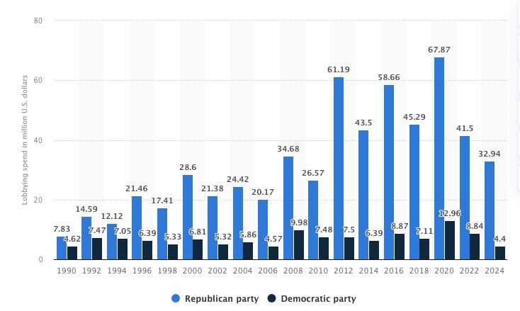 Tuy nhiên, sự khác biệt giữa các đảng không đáng kể (Hình 3). Điều này có thể so sánh với hoạt động của các công ty dầu khí Mỹ ( https://www.statista.com/statistics/788056/us-oil-and-gas-lobbying-spend-by-party/) (Hình 4). Rõ ràng là họ ủng hộ - vì những lý do khách quan - hầu như chỉ dành riêng cho Đảng Cộng hòa.