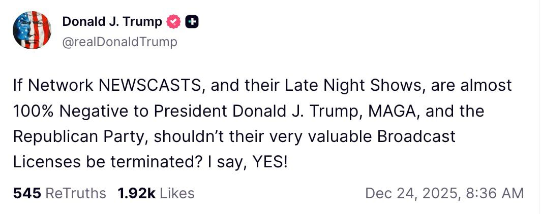 "Nếu các chương trình tin tức truyền hình và các chương trình buổi tối của họ gần như 100% đều tiêu cực đối với Tổng thống Donald J. Trump, phong trào MAGA và Đảng Cộng hòa, thì chẳng phải họ nên bị tước bỏ giấy phép phát sóng vô cùng giá trị của mình sao? Tôi nghĩ là nên!"