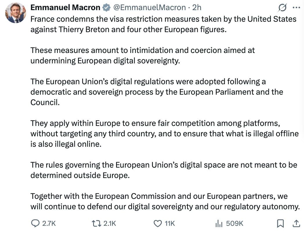 "Pháp lên án các hạn chế về thị thực do Hoa Kỳ áp đặt đối với Thierry Breton và bốn quan chức châu Âu khác. Những biện pháp này cấu thành một hình thức hăm dọa và gây áp lực nhằm làm suy yếu chủ quyền kỹ thuật số của châu Âu. Các quy định kỹ thuật số của Liên minh châu Âu đã được thông qua thông qua một quy trình dân chủ và có chủ quyền bởi Nghị viện châu Âu và Hội đồng EU. Chúng được áp dụng trong phạm vi châu Âu để đảm bảo cạnh tranh công bằng giữa các nền tảng, không nhắm vào bất kỳ quốc gia thứ ba nào và nhằm đảm bảo rằng những gì bất hợp pháp ngoại tuyến cũng là bất hợp pháp trực tuyến. Các quy tắc điều chỉnh không gian kỹ thuật số của Liên minh châu Âu không được định nghĩa bên ngoài châu Âu. Cùng với Ủy ban châu Âu và các đối tác châu Âu của chúng tôi, chúng tôi sẽ tiếp tục bảo vệ chủ quyền kỹ thuật số và quyền tự chủ về quy định của mình."