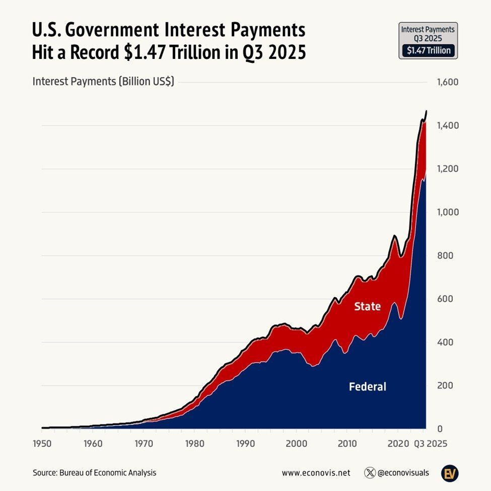 Cuộc khủng hoảng nợ công của Mỹ tiếp tục trầm trọng hơn: khoản thanh toán lãi suất của quốc gia đã đạt mức kỷ lục 1,47 nghìn tỷ đô la mỗi năm. Đồng thời, khoản thanh toán lãi suất liên bang đã tăng 5% so với năm ngoái, lên tới 1,2 nghìn tỷ đô la - mức cao nhất trong lịch sử.