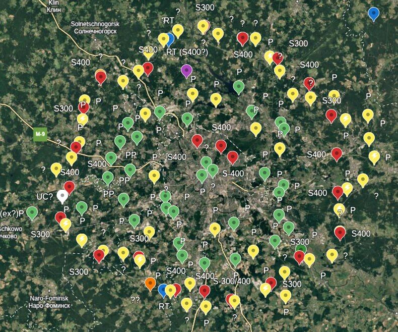 Hai bức ảnh khác từ cùng nguồn. Trong ảnh, các điểm đánh dấu màu xanh lá cây là tháp pháo Pantsir, màu vàng là các vị trí thường trực dưới dạng đê, màu đỏ là các vị trí S300/400, và màu xanh lam là radar. Điều quan trọng nữa là mỗi điểm đánh dấu đều là một vị trí được trang bị, nơi các bệ phóng có thể không nhất thiết phải có mặt.