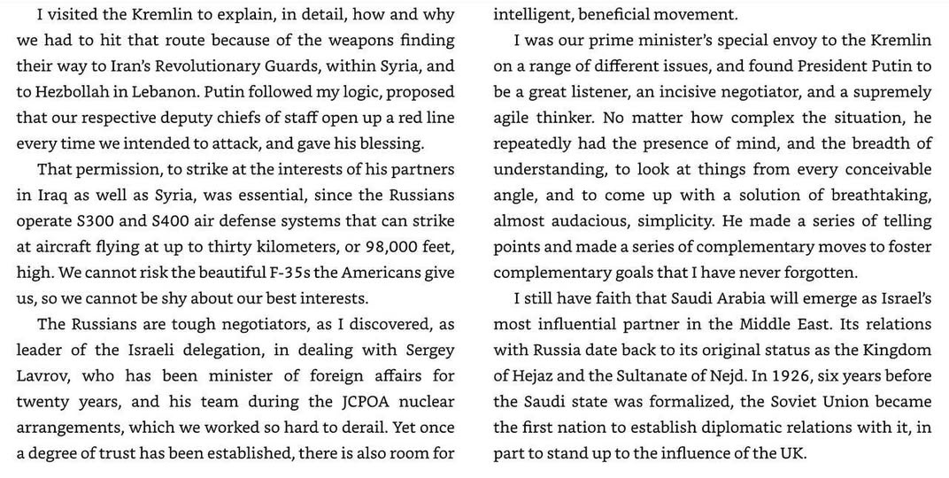 Cohen viết rằng sự đồng ý của Nga là điều then chốt cho các hoạt động của Israel ở Syria và Iraq, vì các hệ thống S-300 và S-400 của Nga có thể đe dọa các tiêm kích F-35 của Israel.