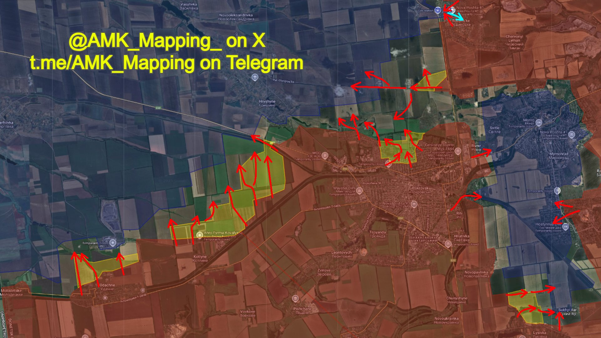 Phía tây Pokrovsk, quân đội Nga đã chọc thủng hệ thống phòng thủ của Ukraine ở phía bắc Kotlyne, chiếm các vị trí trong các hàng cây ở phía bắc và tây bắc. Sau đó, họ tiếp tục tiến xa hơn về phía đông bắc đến các hàng cây tiếp theo trên các cao điểm chiến thuật, trong khi các lực lượng khác tiến về phía bắc từ tuyến đường sắt. Ngoài ra, quân đội Nga đã chiếm được nhiều vị trí hàng cây mới gần Pokrovsk và đạt được thêm tiến triển dọc theo tuyến đường sắt đến phía nam Hryshyne, nơi họ đang bắt đầu đánh úp các vị trí của Ukraine trên các hàng cây còn lại.