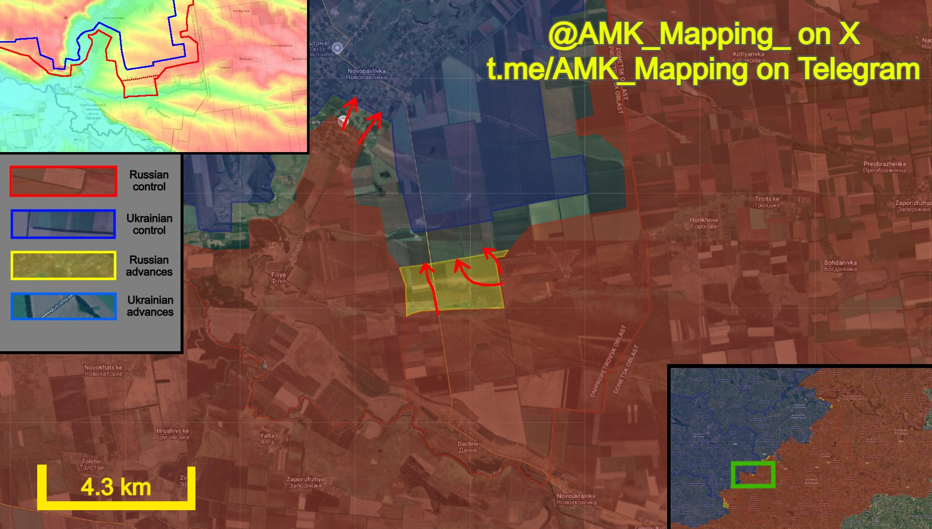 Trong khi đó, tại Novopavlivka, các hoạt động tấn công vẫn tiếp tục ở phía nam thị trấn, với việc quân đội Nga cố gắng tiến thêm về phía trung tâm.