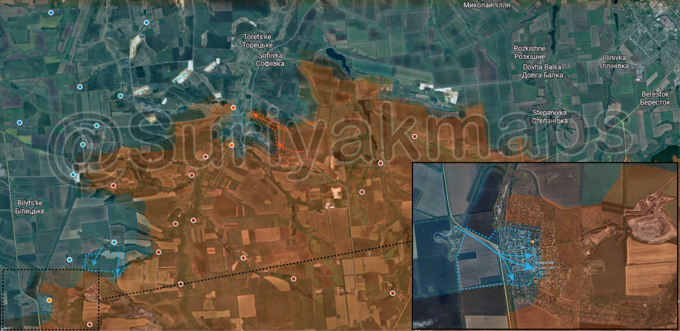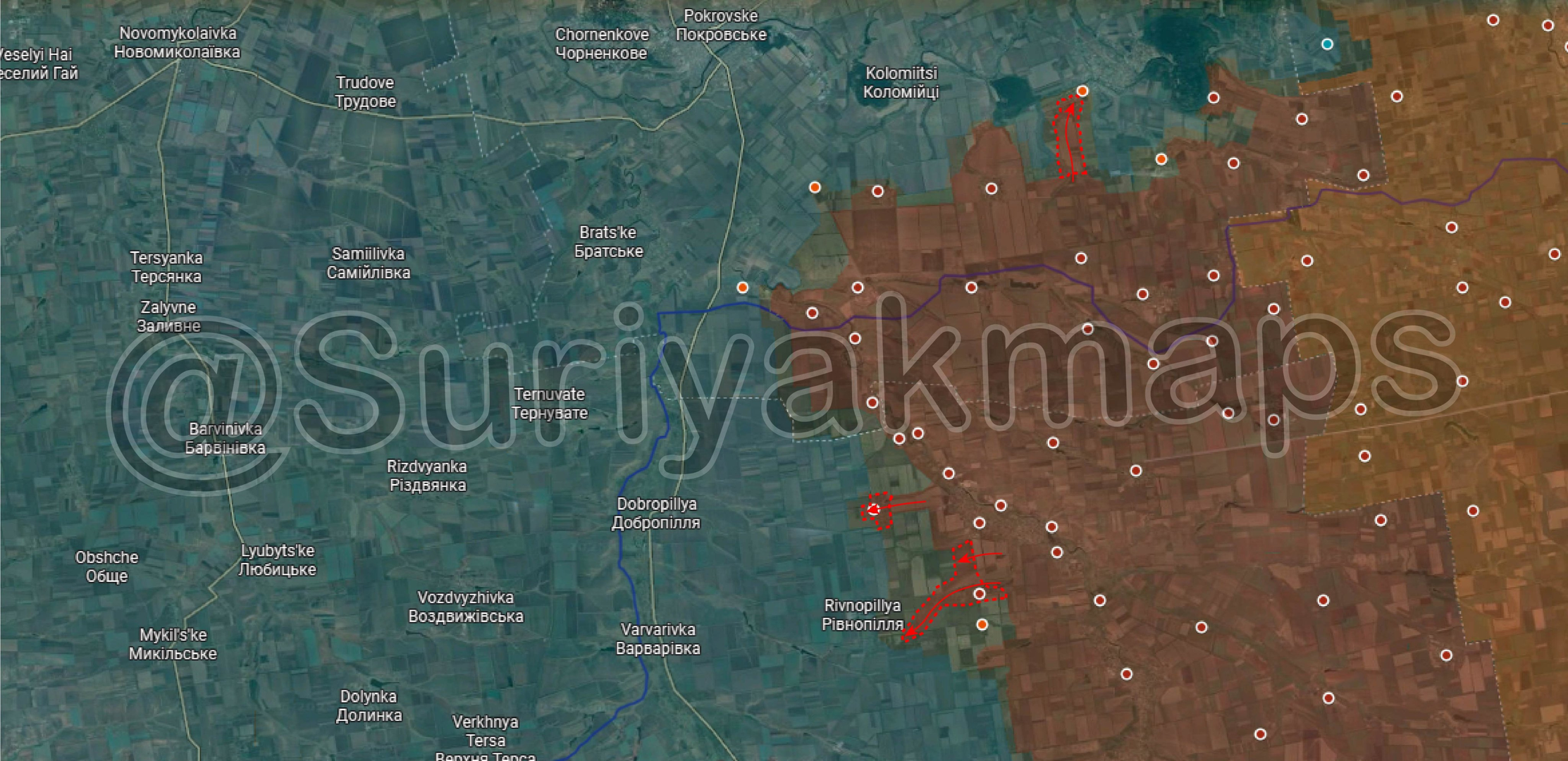 Ở phía nam, quân đội Nga tiếp tục tiến về phía tây Poltavka và bắt đầu vượt qua Vesele từ phía bắc, chiếm giữ các vị trí mới dọc theo đường rừng trên các cao điểm chiến thuật. Xa hơn về phía bắc, sau khi tiến vào Novouspenivske từ phía nam, quân Nga đã giành quyền kiểm soát hoàn toàn ngôi làng và các vị trí xung quanh. Đồng thời, quân Nga đã củng cố lực lượng ở phía bắc Nove và nhanh chóng chiếm được phần còn lại của ngôi làng. Trước đó, bất kỳ binh lính Ukraine nào còn sót lại đều rút khỏi các khu vực phía đông Nove và Novouspenivske để tránh bị bao vây.