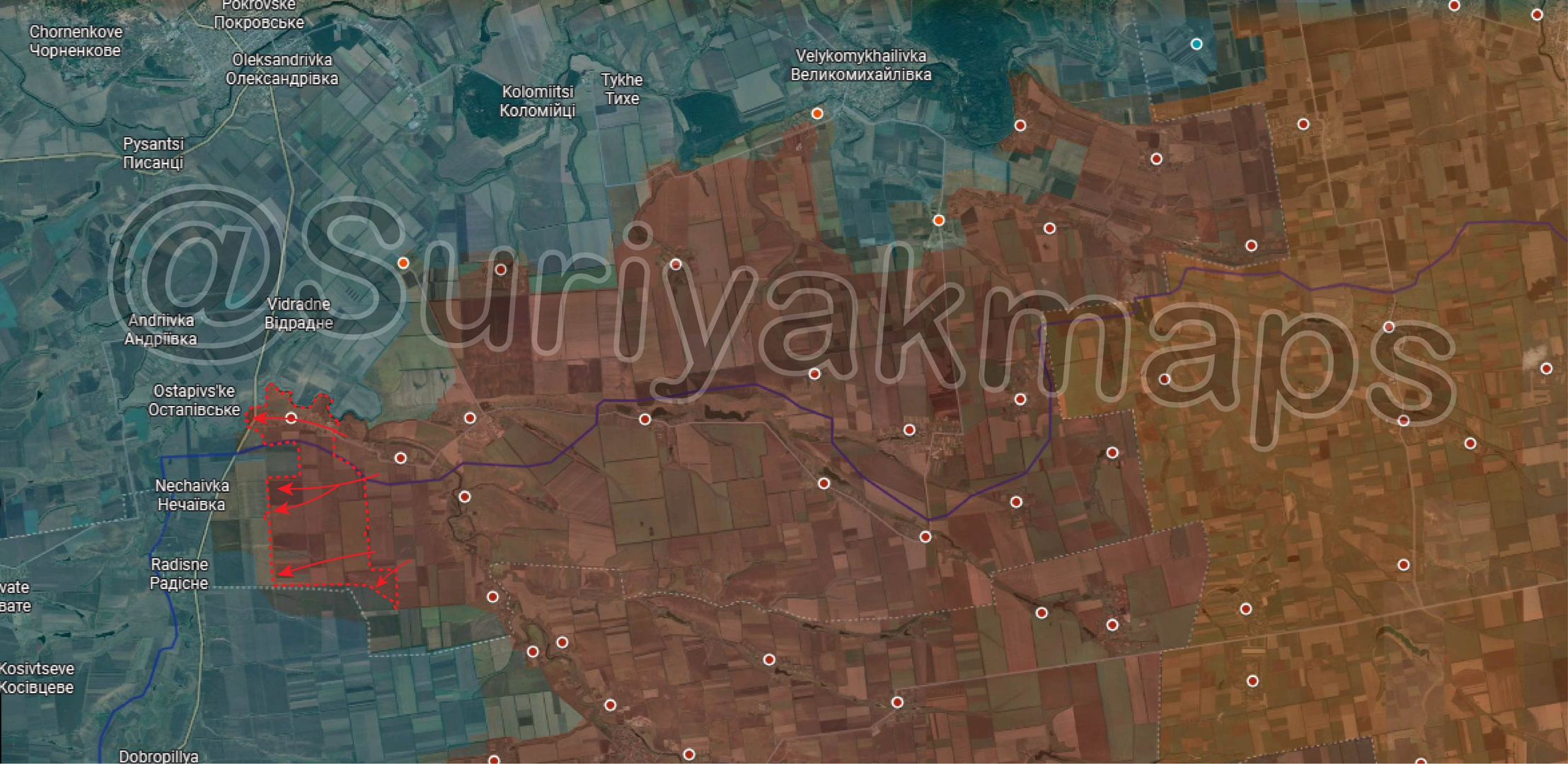 Tình hình trên mặt trận Pokrovskaya và Huliaipole: Sau hai tuần giao tranh, #Quân đội Nga đã kiểm soát hoàn toàn khu vực Danylivka và một số vị trí ở phía nam, qua đó tiến đến đường T-04-01 và vùng ngoại ô của Radisne và Nechaivka.