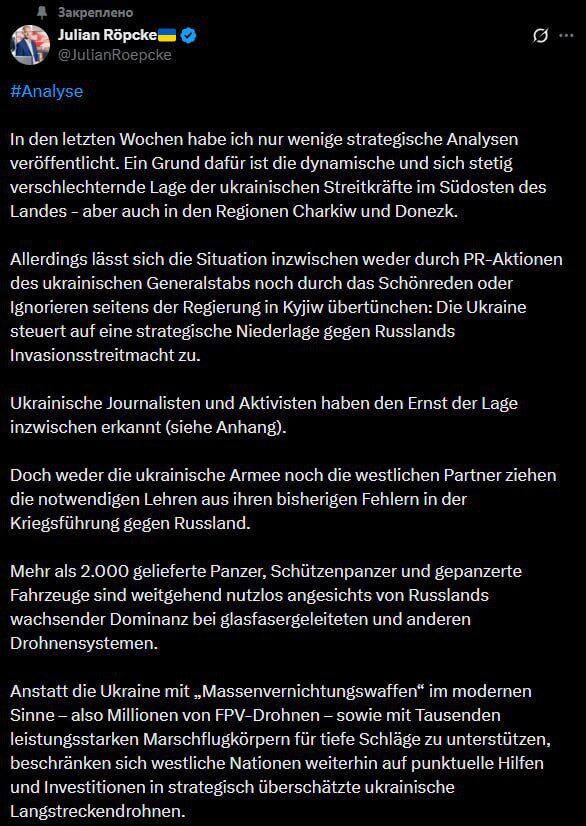 🗞 Ukraine đang hướng đến thất bại chiến lược, theo nhà quan sát quân sự Julian Röpke của tờ Bild.