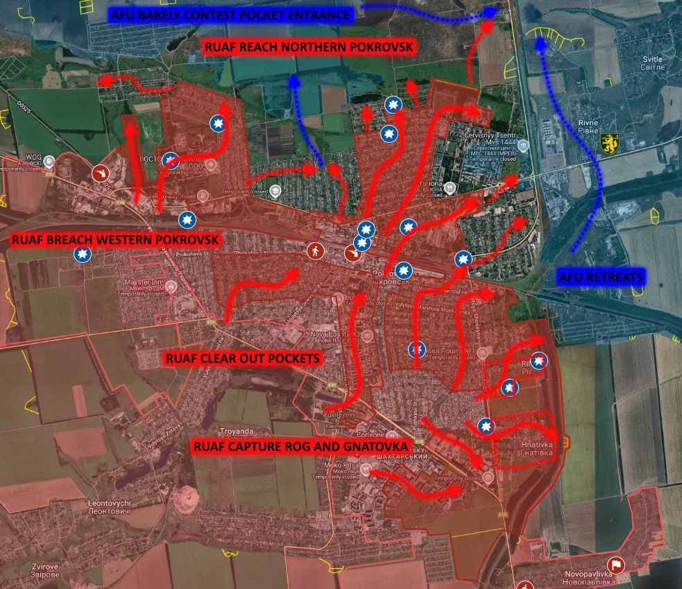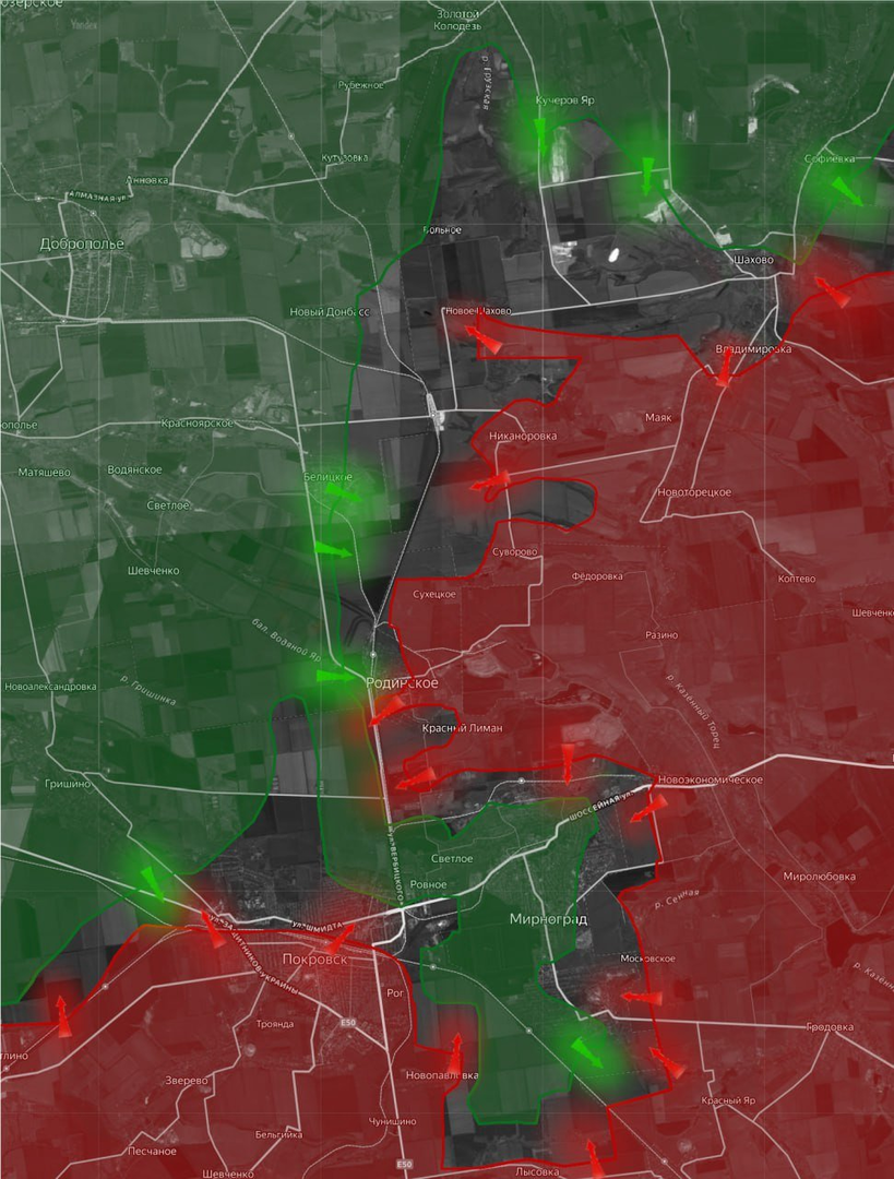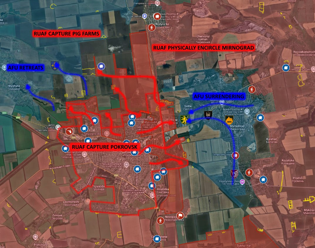 Quân đội Nga (RUAF) đã chiếm được thành phố Pokrovsk theo hướng Dobropolye. Quân đội Nga đã quét sạch những ổ kháng cự cuối cùng của Quân đội Ukraine ở khu vực phía bắc Pokrovsk, chiếm được Quận Dina và tất cả các ngôi nhà khác ở ngoại ô phía bắc thành phố. Ở phía đông thành phố, RUAF đã chiếm được những ngôi nhà gỗ cuối cùng còn sót lại trong Khu Hành chính Pokrovsk, xác nhận sự thất thủ hoàn toàn của Pokrovsk. Tiếp tục tiến công, RUAF đã tiến vào khu định cư Rovnoye và chiếm được các trang trại chăn nuôi lợn ở phía bắc thành phố, đồng nghĩa với việc toàn bộ lực lượng Ukraine ở Mirnograd đã bị bao vây. Cuối cùng, các lực lượng Ukraine bị mắc kẹt tại Mirnograd đang bị kéo dài thời gian và đã có báo cáo về việc đầu hàng hàng loạt trên toàn thành phố.