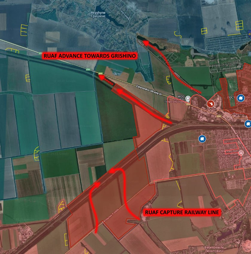 Ở phía Tây Pokrovsk, lực lượng Nga tiếp tục tiến về phía bắc qua các cánh đồng trên các cao điểm chiến thuật, và đã tiến lên năm hàng cây song song, đến tận cùng phía bắc của họ. Ngoài ra, một số binh sĩ đang cố gắng xâm nhập vào khu rừng nhỏ phía tây Hryshyne, tuy nhiên khó có khả năng họ có thể củng cố lực lượng ở đó. Bộ chỉ huy Ukraine đã đưa thêm quân tiếp viện đến Hryshyne, nơi họ hiện đang thăm dò các vị trí của Nga trong các ngôi nhà gỗ ở ngoại ô phía đông nam của ngôi làng. Điều này đang gây khó khăn đáng kể cho bước tiến tiếp theo của Nga trong khu vực.