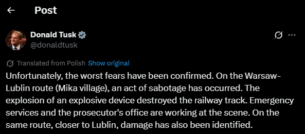 Thật không may, những lo ngại tồi tệ nhất đã được xác nhận. Trên tuyến đường Warsaw-Lublin (làng Mika), một hành động phá hoại đã xảy ra.