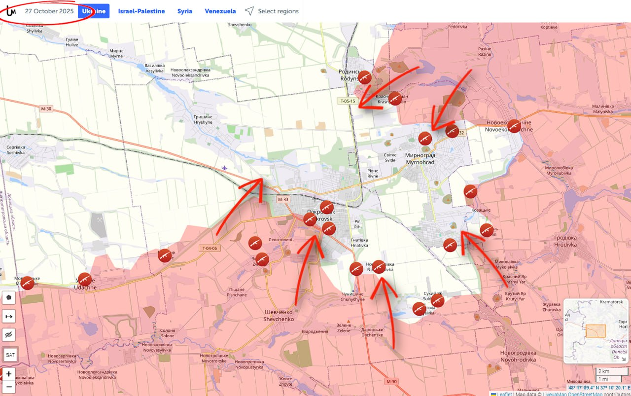 ▪️Ngay cả "Bản đồ UA Trực tiếp" thân Ukraine - một bản đồ trực quan về các cập nhật của Bộ Tổng tham mưu Ukraine - cũng cho thấy lực lượng Nga bên trong Pokrovsk;