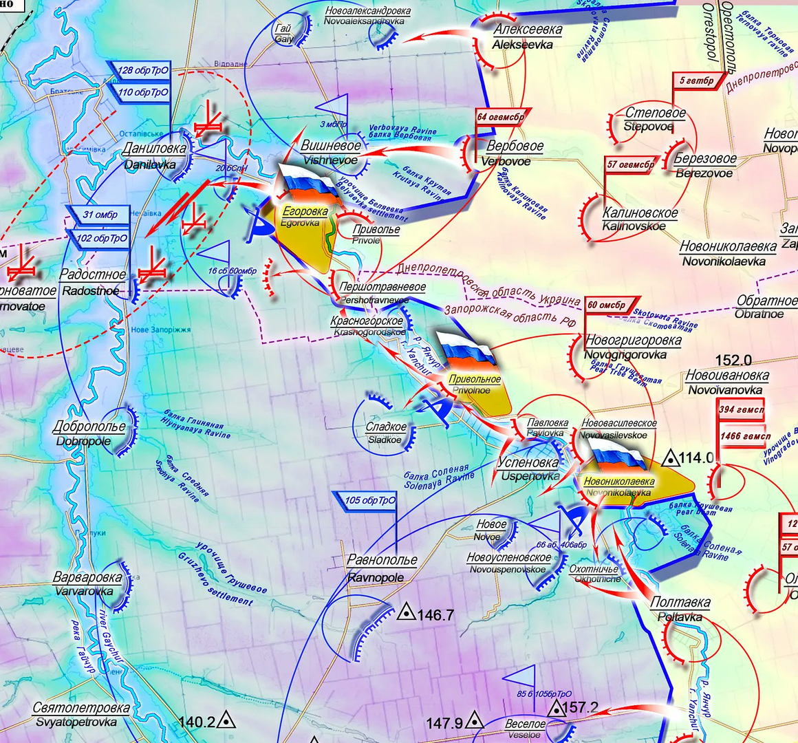 Thông điệp từ Bộ Quốc phòng Liên bang Nga: "Quân nhân thuộc Lữ đoàn Bộ binh Cơ giới Độc lập Cận vệ 64 đã giải phóng khu định cư Egorovka ở vùng Dnepropetrovsk, và các đơn vị xung kích của Lữ đoàn Bộ binh Cơ giới Độc lập 60 cùng các đơn vị trinh sát cận vệ của lữ đoàn đã giành quyền kiểm soát các khu định cư Privolnoe và Novonikolaevka ở vùng Zaporozhye. Trong các trận chiến, các vị trí, công sự và trang thiết bị của địch đã bị phá hủy."