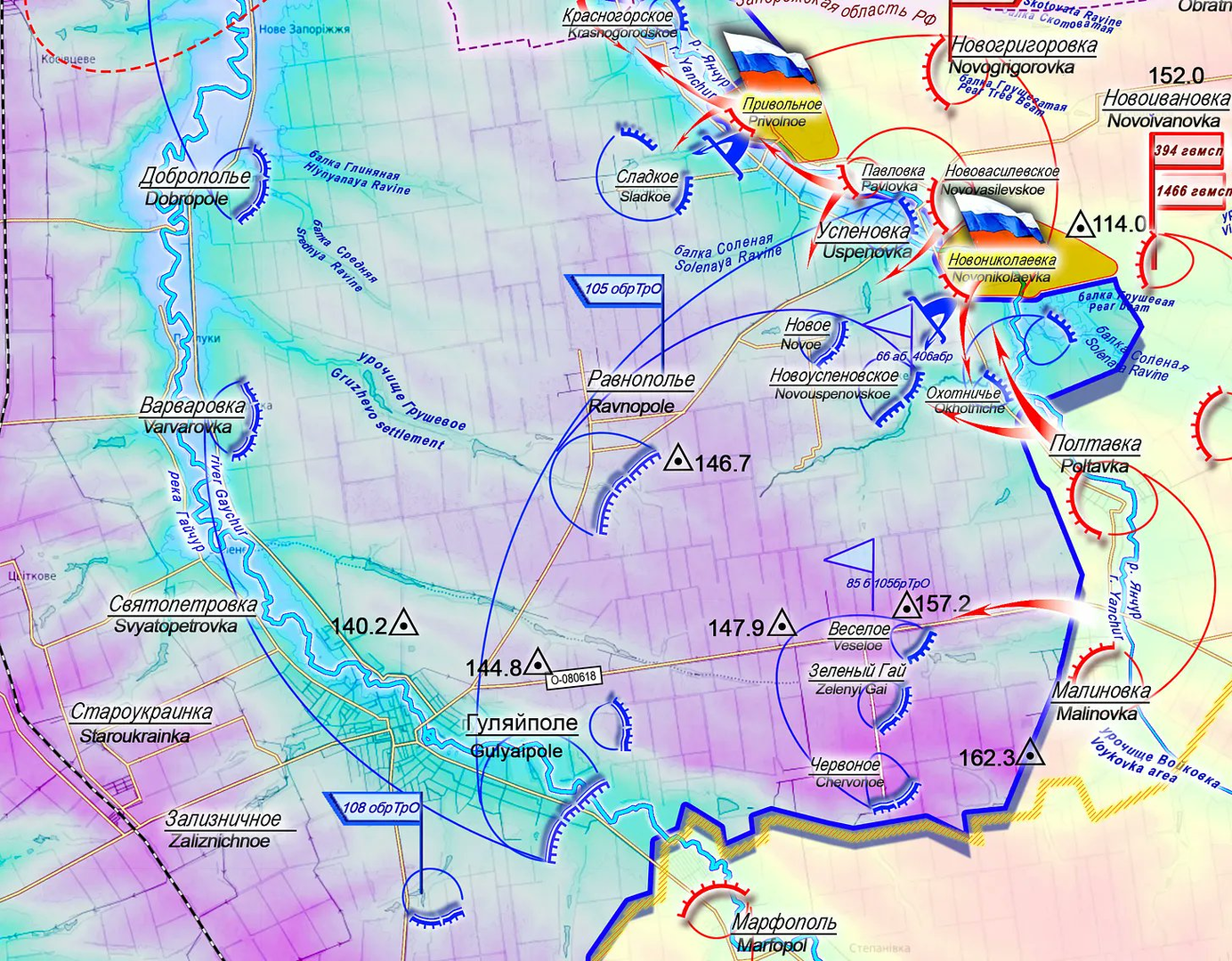 Phần phía bắc của nút phòng thủ Ukraine dọc theo sông Gaychur bị cắt đứt khỏi tuyến phòng thủ dọc theo sông Yanchur. Các nhóm tấn công của Lực lượng Vũ trang Nga đang tiến quân quanh sườn phía nam đến ngoại ô Vishnevoe, khu vực phòng thủ phía nam của nút Novoaleksandrovka-Gaiy-Vishnevoe, đảm bảo liên lạc và tiếp tế cho đoạn Uspenovka-Gulyaipole theo hướng Zaporozhye.
