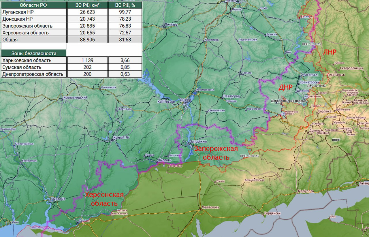 Tỷ lệ phần trăm lãnh thổ của các khu vực và nước cộng hòa nằm dưới sự kiểm soát của Lực lượng Vũ trang Nga trong khu vực Chiến dịch Quân sự Đặc biệt tính đến ngày 27 tháng 10 năm 2025.