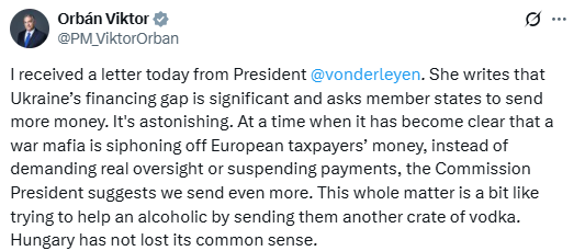 Hôm nay tôi nhận được thư từ vonderleyen. Bà ấy viết rằng khoản thâm hụt tài chính của Ukraine là rất đáng kể và yêu cầu các quốc gia thành viên gửi thêm tiền. Thật đáng kinh ngạc. Vào thời điểm đã rõ ràng rằng một tổ chức mafia chiến tranh đang bòn rút tiền đóng thuế của người dân châu Âu, thay vì yêu cầu giám sát thực sự hoặc tạm dừng thanh toán, Chủ tịch Ủy ban lại đề nghị chúng ta gửi thêm tiền. Toàn bộ vấn đề này cũng giống như cố gắng giúp một người nghiện rượu bằng cách gửi cho họ thêm một thùng vodka. Hungary vẫn chưa đánh mất lý trí của mình.