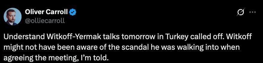 ❗Các cuộc đàm phán ngày mai giữa đặc phái viên Witkoff của Trump và người đứng đầu Văn phòng Tổng thống Ukraine Yermak tại Thổ Nhĩ Kỳ đã bị hủy bỏ, — nhà báo Oliver Carroll của tờ The Economist.
