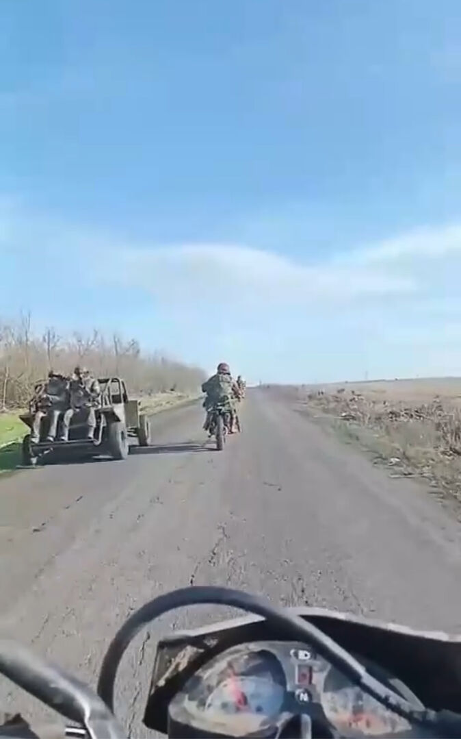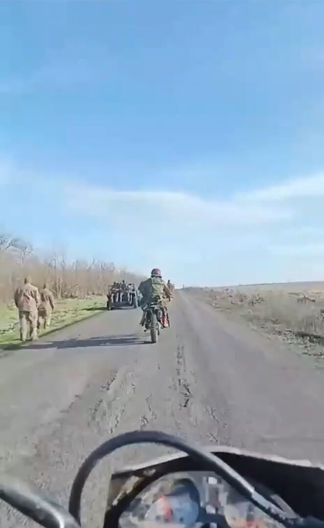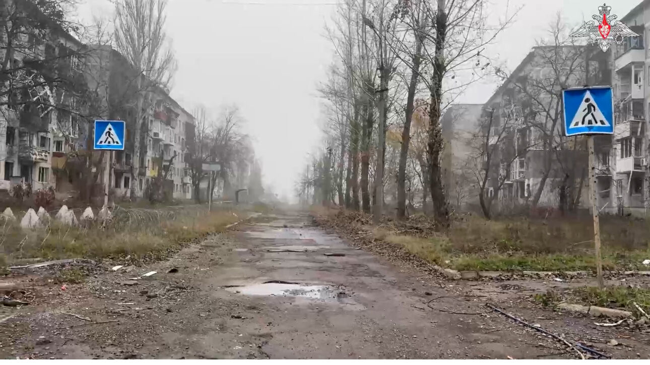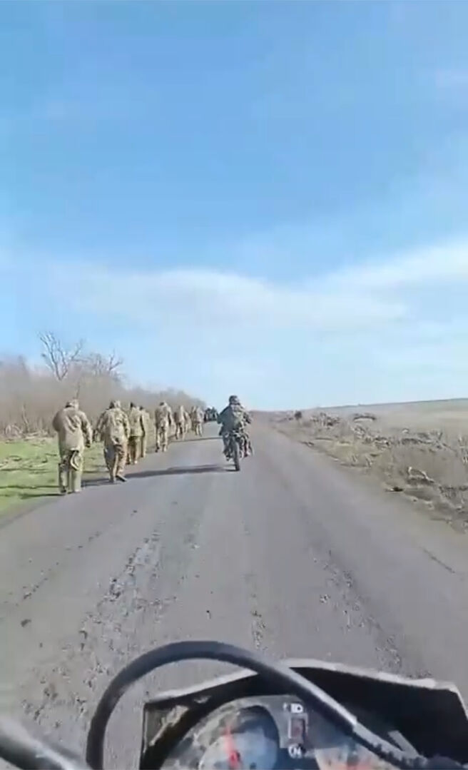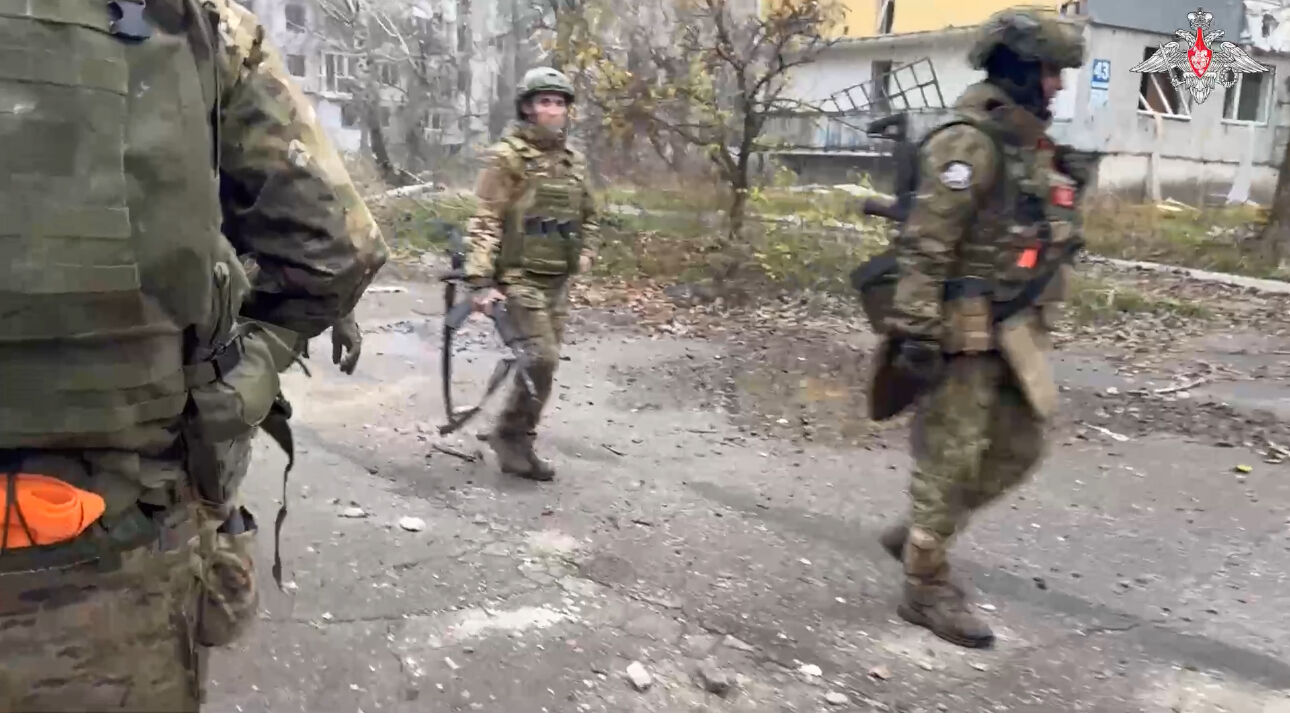Cảnh quay cho thấy các binh sĩ thuộc nhóm "Trung tâm" của Lực lượng di chuyển tự do qua quận Shakhtarsky đã được giải phóng thuộc Pokrovsk