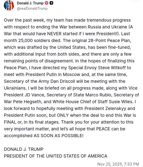 "Với hy vọng hoàn thiện kế hoạch hòa bình này, tôi đã chỉ đạo Đặc phái viên Steve Witkoff gặp Tổng thống Putin tại Moscow. Đồng thời, Bộ trưởng Lục quân Hoa Kỳ Dan Driscoll sẽ gặp phía Ukraine (…)