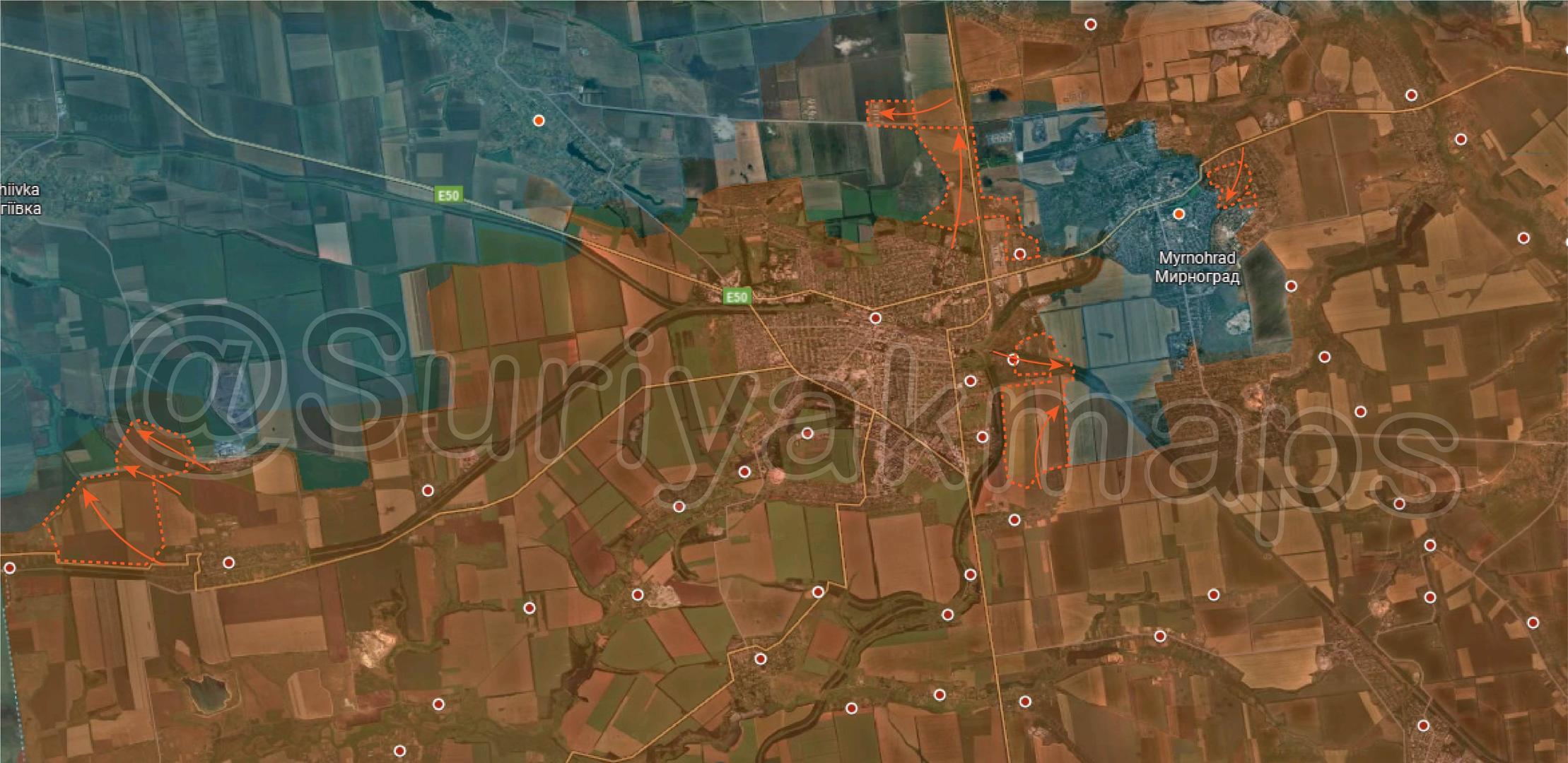 Ngoài ra, quân Nga tiếp tục tiến về phía đông Pokrovsk, kiểm soát hoàn toàn vùng ngoại ô Kohozhkine, các chiến hào và khu thể thao liền kề. Trong khi đó, ở phía bắc Myrnohrad, quân đội Nga đã giành quyền kiểm soát hoàn toàn quận 8.
