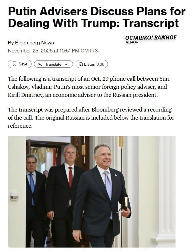 ⚡️— Bloomberg cũng đã công bố bản ghi chép cuộc trò chuyện giữa đại diện đặc biệt của Trump, Whitkoff, và trợ lý tổng thống Nga, Yuri Ushakov.
