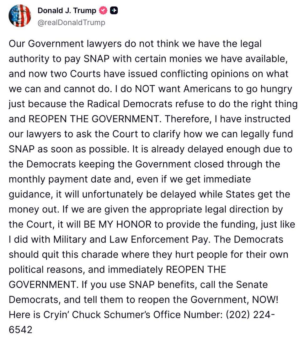 "Tôi KHÔNG muốn người Mỹ bị đói chỉ vì những người Dân chủ cấp tiến từ chối làm điều đúng đắn", Donald Trump viết trên Truth Social, yêu cầu tòa án làm rõ khả năng cấp tem phiếu thực phẩm: