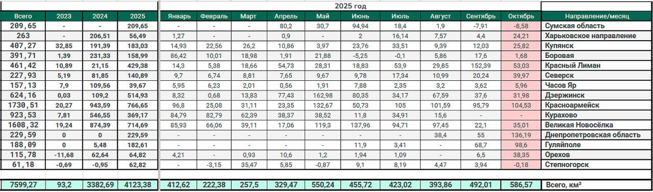 Bảng tóm tắt những thay đổi về lãnh thổ trên bản đồ Creamy Caprice ( http://www.creamy-caprice.net/) liên quan đến các hoạt động chiến đấu tại khu vực SVO trong tháng 10 năm 2025.