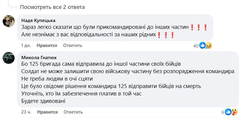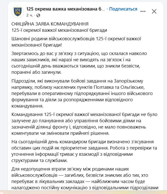 Tài khoản chính thức của lữ đoàn đã đăng một tuyên bố rằng Bộ tư lệnh Lữ đoàn Cơ giới Độc lập 125 không chịu trách nhiệm về những binh lính được phân công đến các đơn vị khác.