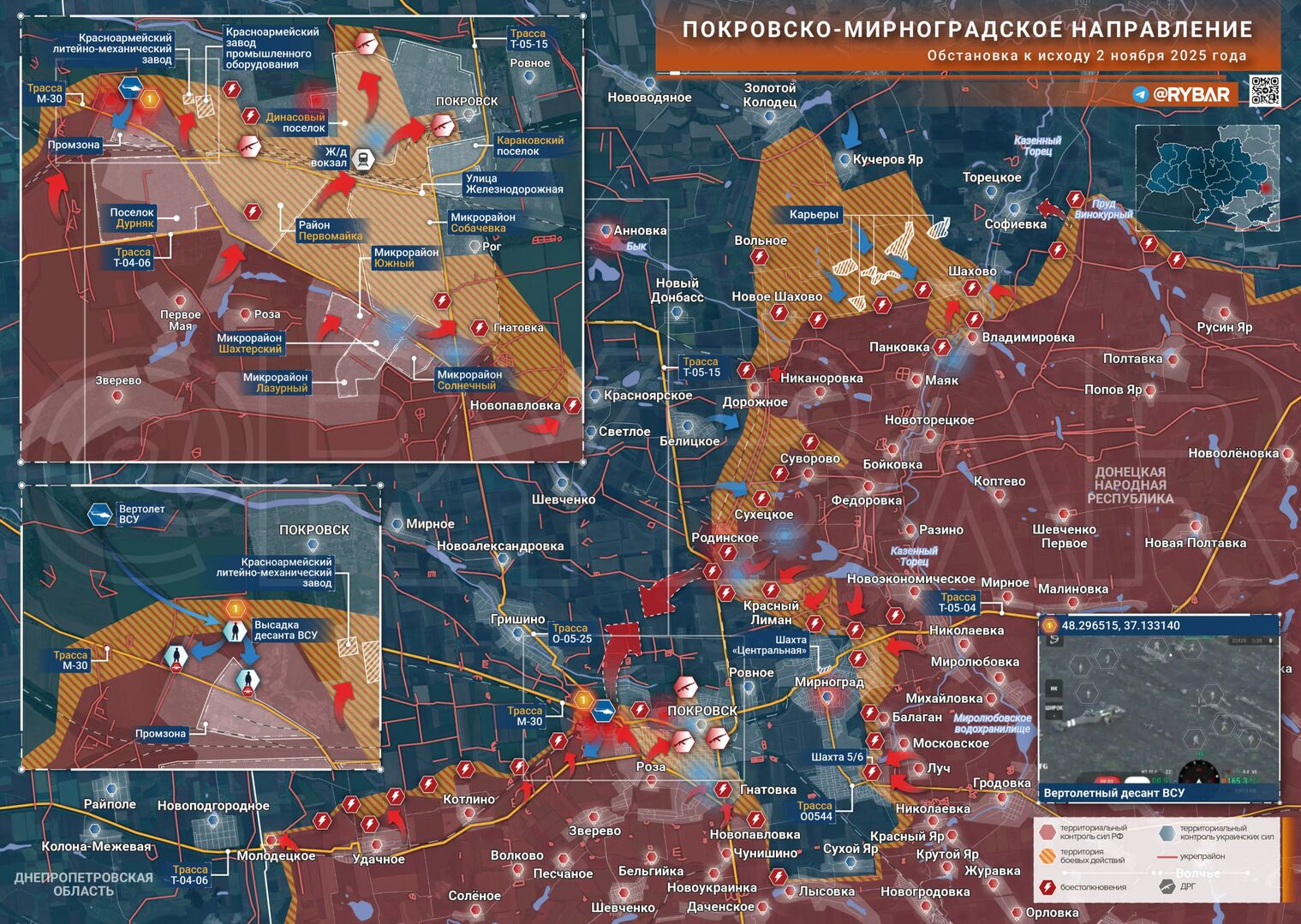 Tại khu vực Pokrovsk-Mirnograd, lực lượng Ukraine đã thực hiện một chiến dịch truyền thông tự sát, bao gồm một trực thăng hạ cánh xuống vùng ngoại ô phía tây bắc của Pokrovsk, kết thúc bằng việc đánh tan đơn vị GUR đổ bộ.