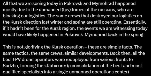"Mọi thứ chúng ta thấy hôm nay ở Pokrovsk và Myrnohrad chủ yếu là do các UAV của Nga, chúng đang cản trở hậu cần của chúng ta. Chính những lữ đoàn đã phá hủy hậu cần của chúng ta theo hướng Kursk vào mùa đông và mùa xuân năm ngoái vẫn tiếp tục hoạt động", một chiến binh khác đồng tình.