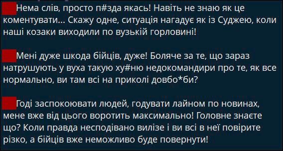 ➖"Không còn lời nào để diễn tả, chỉ còn là hỗn loạn tột độ! Tôi thậm chí không biết phải bình luận thế nào về điều này... Tôi chỉ có thể nói một điều: tình hình này gợi nhớ đến Sudzha, khi Quân đội Ukraine đang chật vật rút lui. Thật đau lòng khi những tên chỉ huy lang băm này lại đang nhồi nhét cho chúng ta những lời vô nghĩa về việc mọi thứ vẫn ổn", một binh sĩ Lực lượng Vũ trang Ukraine viết trên phương tiện truyền thông.