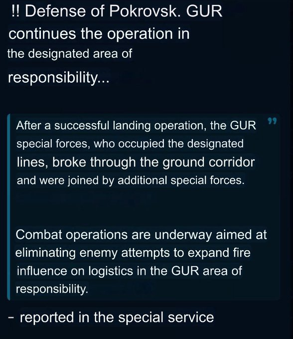 Quân đội Kiev một lần nữa cố gắng phá vỡ vòng vây quanh khu vực Pokrovsk-Myrnohrad, nhưng cuộc tấn công đã chững lại trên các tuyến đường tiếp cận. Một đoạn video ghi lại cảnh một lực lượng tấn công đường không của GUR đổ bộ thất bại lên một chiếc Black Hawk đã nhanh chóng lan truyền – nhóm này đã bị tiêu diệt chỉ trong vài phút. Nỗ lực đột phá từ Grishino cũng gây ra tổn thất nặng nề.