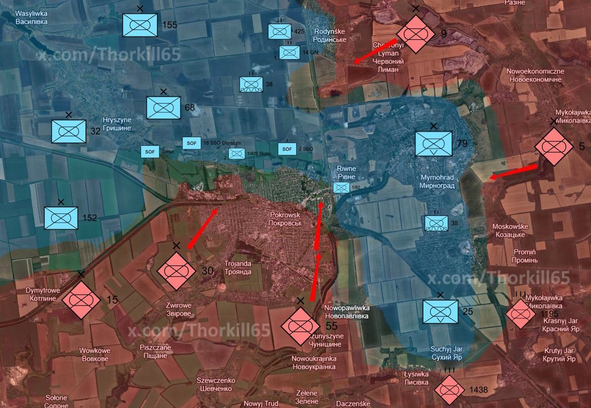 Thông tin từ Pokrovsk hôm qua và hôm nay cho thấy trận chiến giành thành phố đang dần kết thúc. Quân đội Ukraine đã bị đẩy lùi. Tôi cố tình không sử dụng thuật ngữ "rút lui", vì từ này thường ám chỉ một hành động có trật tự và có mục đích. Trong trường hợp này, các đơn vị bị đánh tan tác của Lữ đoàn Yegro 68 và Lữ đoàn 155 đã hành quân bộ ra khỏi thành phố từ ngày 27 tháng 10 đến ngày 4 tháng 11, qua các cánh đồng giữa quận 8 và quận Dinas, bị máy bay không người lái Rubicon tấn công và pháo tự hành FAB bắn phá. Như các video do Rubicon công bố cho thấy, một số binh sĩ Ukraine đã thiệt mạng trong cuộc hành quân này. Theo nhà báo Ukraine Yulia Kirienko-Merinova của TCH, các nhóm binh sĩ khác từ cả hai lữ đoàn vẫn bị mắc kẹt ở phía nam thành phố, có thể là ở khu vực trung tâm thành phố và quận Prospekt (48.2739, 37.17921), và trong các cứ điểm phía nam Pokrovsk. Tàn quân của Lữ đoàn Yeger 68 và Lữ đoàn Bộ binh 155 hiện đang chiếm đóng các tuyến phòng thủ khác của Ukraine tại khu vực Hryshine-Shevchenko.