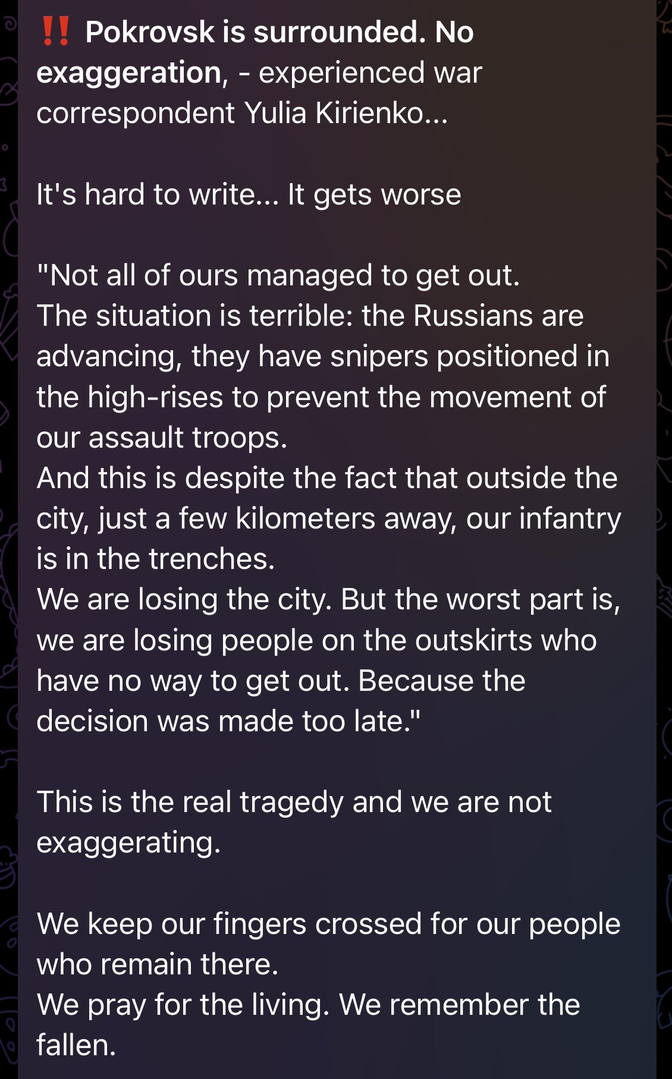còn uca:Pokrovsk bị bao vây. Không hề phóng đại, - phóng viên chiến trường giàu kinh nghiệm Yulia Kirienko... Thật khó để viết... Mọi chuyện còn tệ hơn nữa "Không phải tất cả chúng tôi đều thoát ra được. Tình hình thật tồi tệ: quân Nga đang tiến công, họ bố trí lính bắn tỉa trên các tòa nhà cao tầng để ngăn chặn sự di chuyển của quân tấn công của chúng tôi. Và điều này xảy ra bất chấp thực tế là bên ngoài thành phố, chỉ cách đó vài km, bộ binh của chúng tôi đang ở trong chiến hào. Chúng tôi đang mất thành phố. Nhưng điều tồi tệ nhất là, chúng tôi đang mất đi những người ở vùng ngoại ô, những người không có cách nào thoát ra. Bởi vì quyết định được đưa ra quá muộn." Đây là thảm kịch thực sự và chúng tôi không hề phóng đại. Chúng tôi cầu nguyện cho những người còn sống. Chúng tôi tưởng nhớ những người đã ngã xuống.