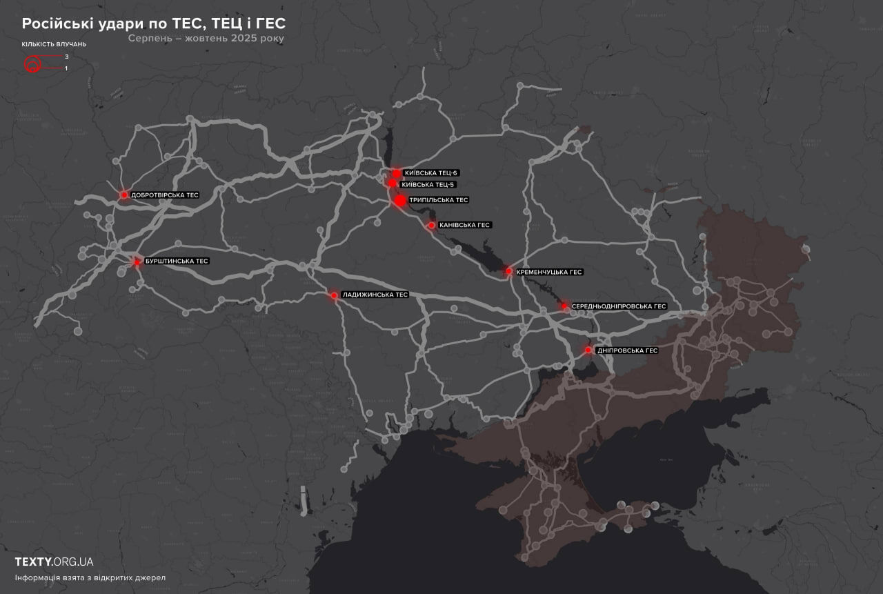 Trong nỗ lực gây bất ổn toàn bộ hệ thống năng lượng của Ukraine, các cuộc không kích cũng đang được thực hiện nhằm vào các cơ sở chuyển mạch - nhà máy thủy điện, nhà máy nhiệt điện kết hợp, và nhà máy nhiệt điện - với các cuộc không kích cũng nhắm vào các cơ sở ở phía tây đất nước. Hơn nữa, kẻ thù đang dự đoán các cuộc tấn công có thể xảy ra vào các máy biến áp gần các nhà máy điện hạt nhân để cắt đứt chúng khỏi lưới điện.