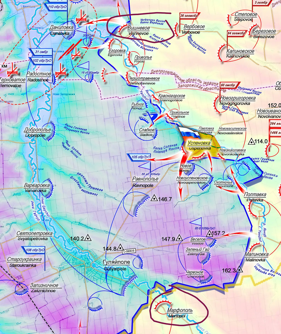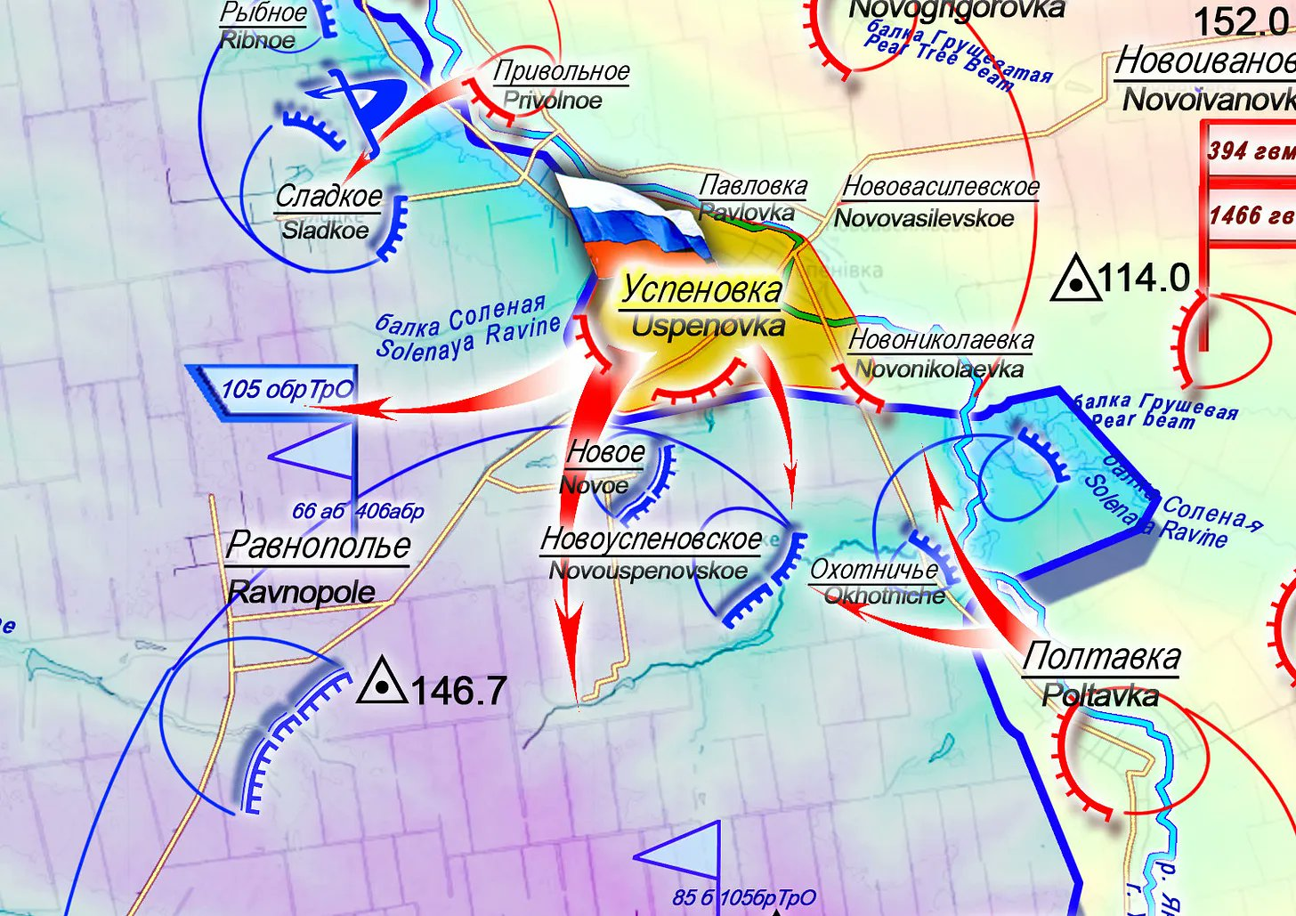 Trên bản đồ, khu vực Uspenovka của Lực lượng Vũ trang Ukraine hiện rõ, với các căn cứ phía bắc và phía nam (Vishnevoe và Marfopol) do quân đội Nga kiểm soát. Việc vượt sông Yanchur theo tuyến đường Uspenovka - Ravnopole - Gulyaipole sẽ cắt đứt khu vực này và cho phép nhóm Nga tạo thành một đầu cầu để tiếp tục bao vây các vị trí của địch ở vùng giao lưu, chặn đường tiếp tế của chúng.