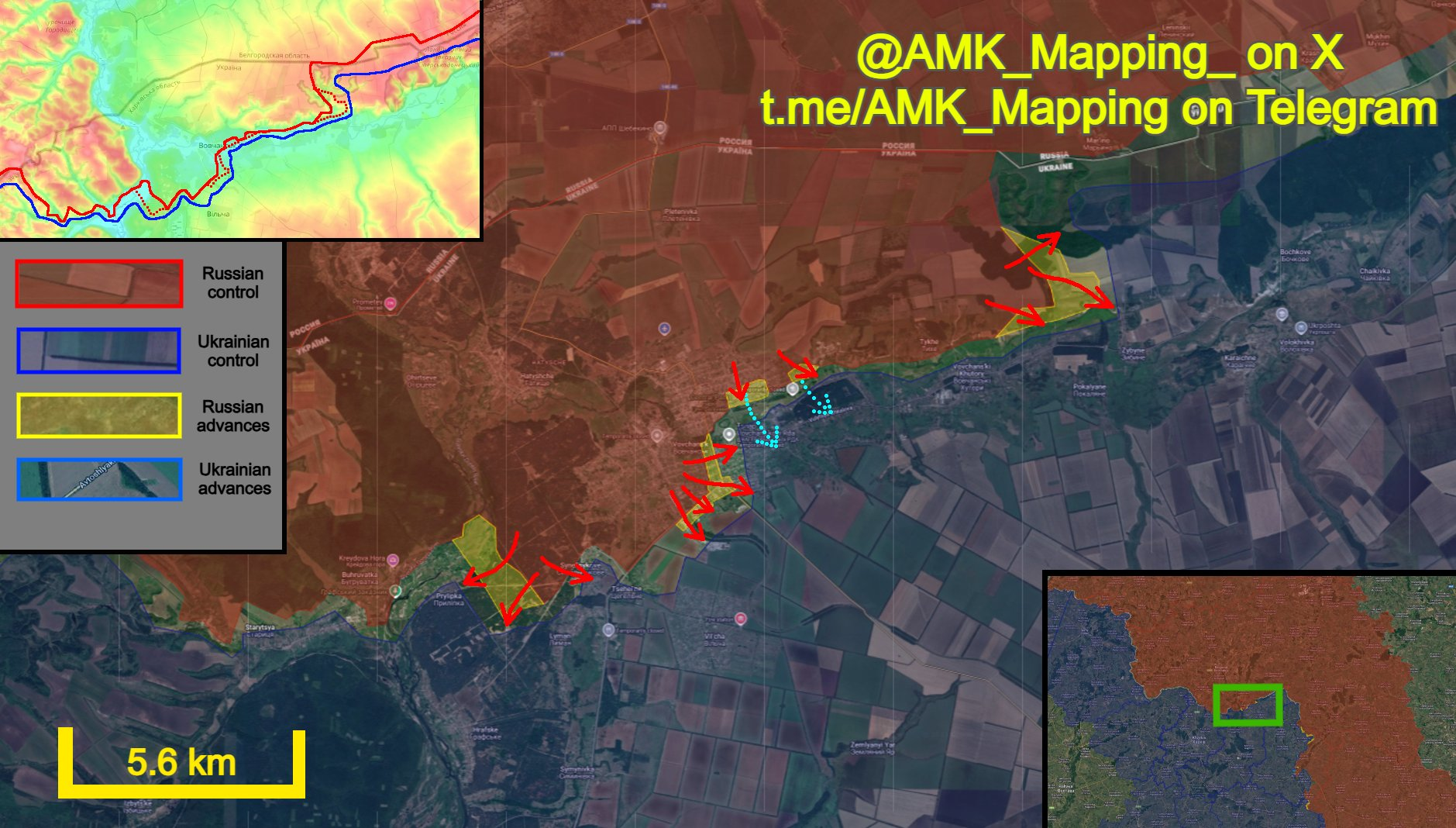 Về phía đông, quân đội Nga tiếp tục tiến qua phía nam Vovchansk và đã tiến từ các tòa nhà ba tầng đến khu công nghiệp nhỏ ở rìa phía nam của thành phố, chiếm được hầu hết khu vực này. Họ cũng tiếp tục tiến về phía đông qua các khu dân cư thấp tầng, nơi họ tiếp cận đường cao tốc và phá hủy cây cầu bắc qua sông Vovcha, và tiến xa hơn đường cao tốc vào các khu dân cư đông đúc hơn ở phía nam Vovchansk.
