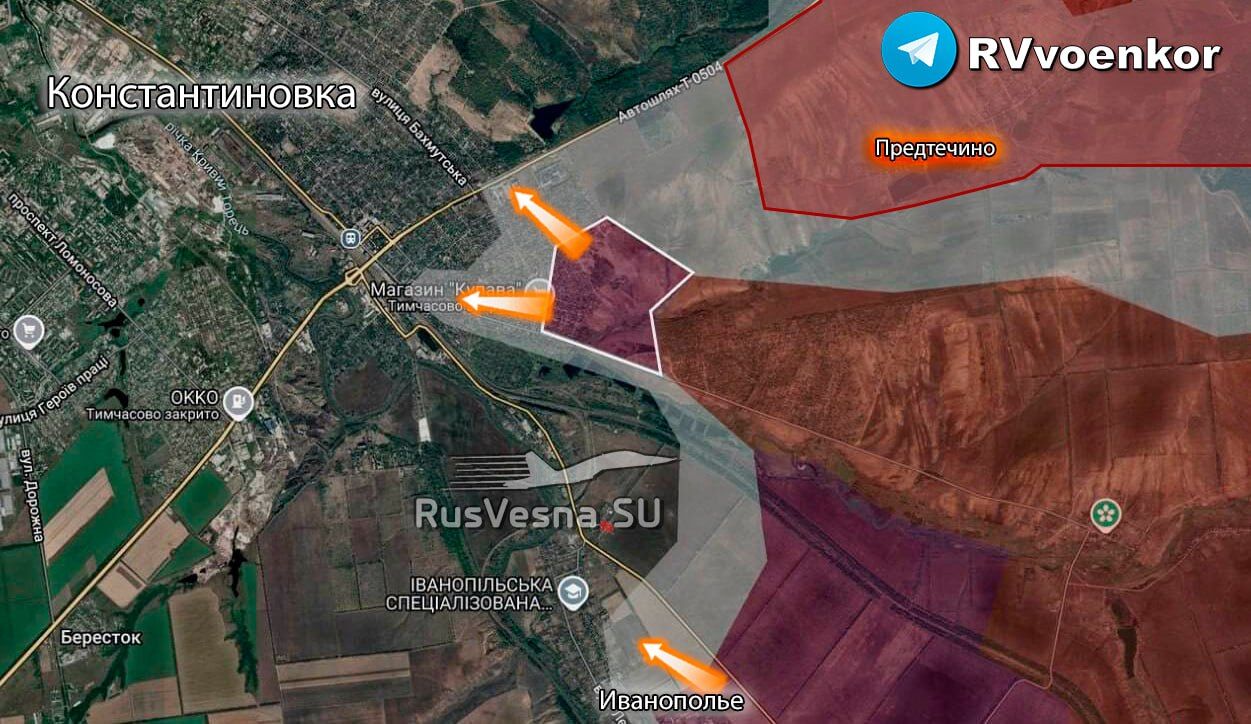 ▪️Quân đội Nga tiếp tục tiến về phía đông nam thành phố và đang giành được chỗ đứng trong khu vực dân cư. ▪️Khu vực tiến công: hơn 1 km. ▪️Quân đội Nga trước đó đã đột phá qua phía nam Kostyantynivka, tấn công một số cứ điểm của Lực lượng Vũ trang Ukraine dọc theo vành đai rừng gần đường sắt và đột phá vào Ivanopil, củng cố vị trí trong làng và tiến vào trung tâm thành phố.