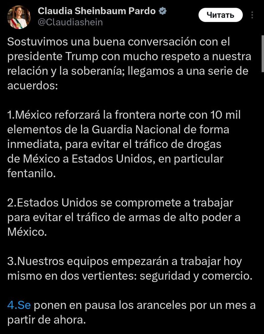 Hoa Kỳ tạm thời hoãn việc áp dụng mức thuế hải quan tăng đối với hàng hóa từ Mexico trong một tháng. Tổng thống nước này, Claudia Sheinbaum, đã viết về điều này trên mạng xã hội X (bị cấm ở Nga) sau cuộc trò chuyện với Donald Trump.
